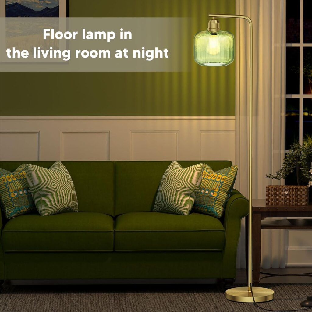 Glass Floor Lamp for Living Room, Modern Standing Lamp with Green Ribbed Glass Lampshade and Pedal Switch, 66” Tall Lamp & Gold Floor Lamp for Bedroom Study Room,Brushed Gold(3000K LED Bulb Included)